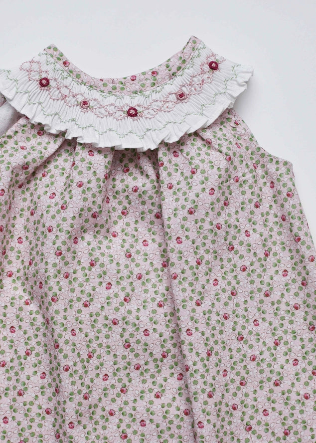 Cute toddler dress with panties featuring a charming white collar hand-embroidered in a smock stitch on a delicate pink fabric adorned with pastel-colored flowers.