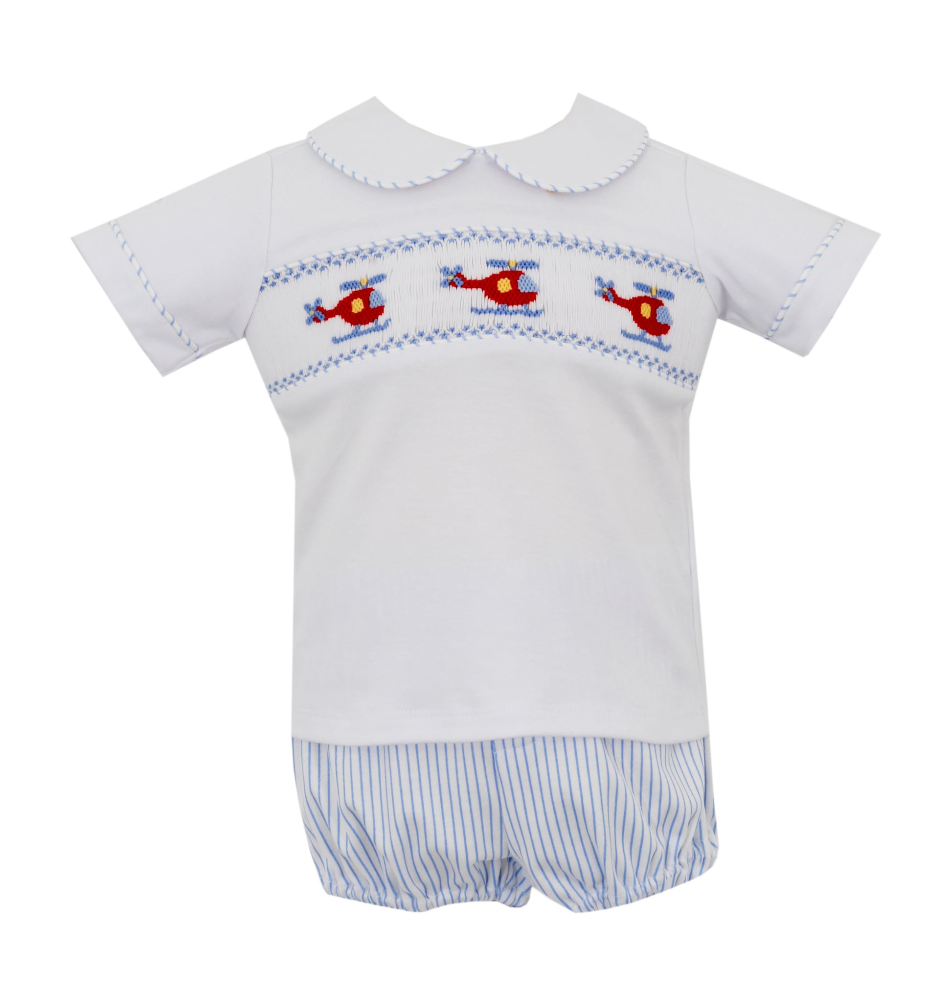 Petit Bebe Blue Stripe Knit Diaper Set with Helicopter Smocking
