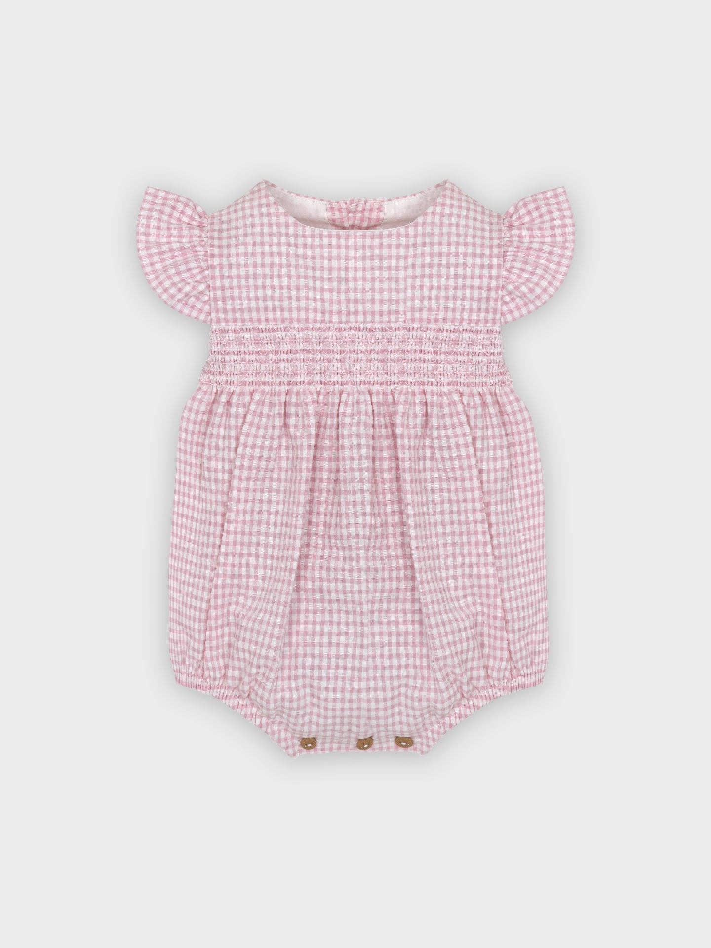 Cute in 100% cotton fabric, ideal for baby girls, up to 36 months. The fluffy tightens on the back and between the legs. Ruffles on the sleeves. Available in pink color.