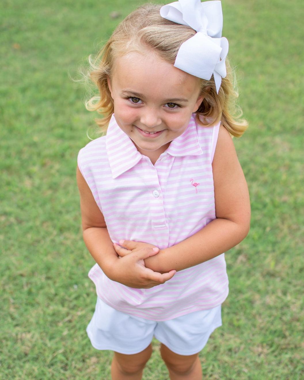 Pink striped fabric with a small flamingo embroidered on chest. Straight collar. Buttons in front. White shorts with pockets. Pink details on pockets and a bow on waist.