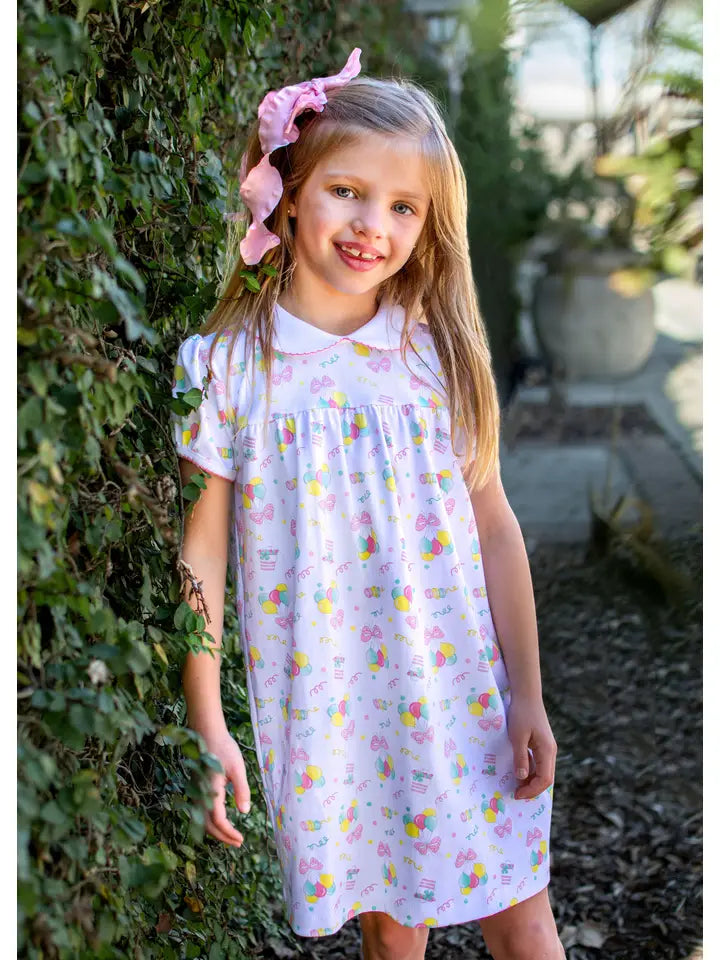 This fun birthday dress made from 100% pima cotton. The fabric print has balloons, macaroons on white background. White collar with pink trim.