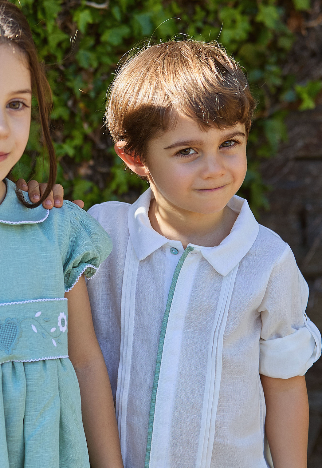 This gorgeous set for boys, crafted by Deolinda, a Portuguese brand, features a delightful combination of white and pistachio colors. It's the perfect ensemble for the upcoming spring and summer weather, made from the freshest materials and showcasing high-quality craftsmanship.
