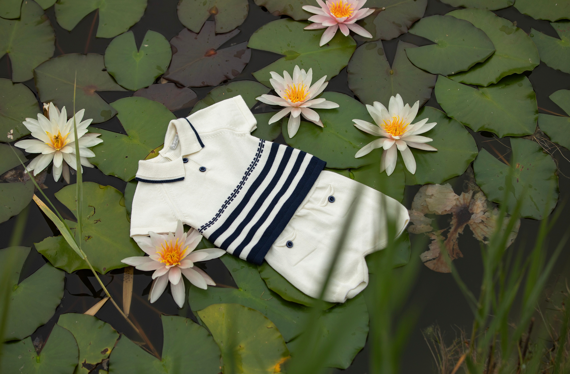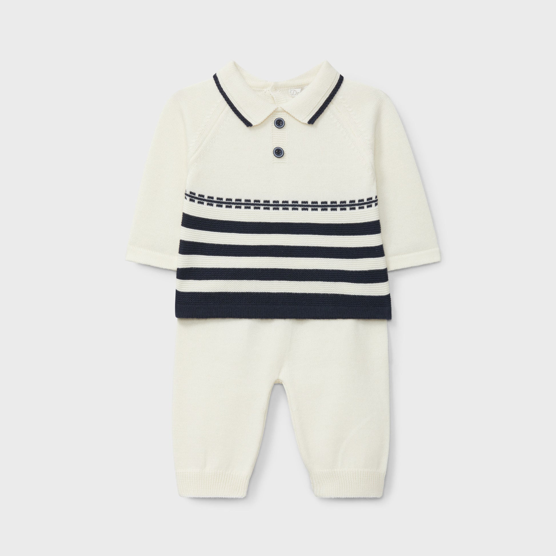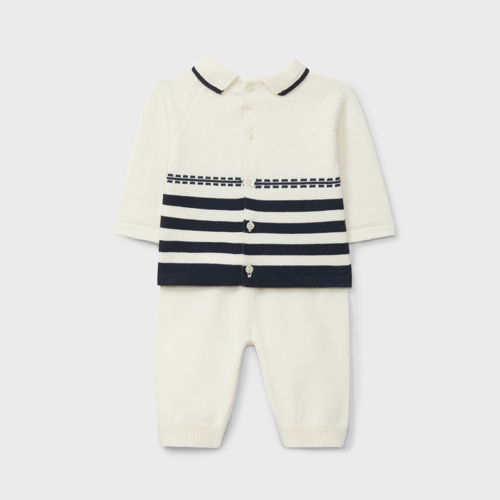 A charming and comfortable choice for newborn boys. This set includes a striped long-sleeve top and footless pants, crafted from 100% cotton for a soft and breathable feel. Perfect for everyday wear with a classic and timeless design.