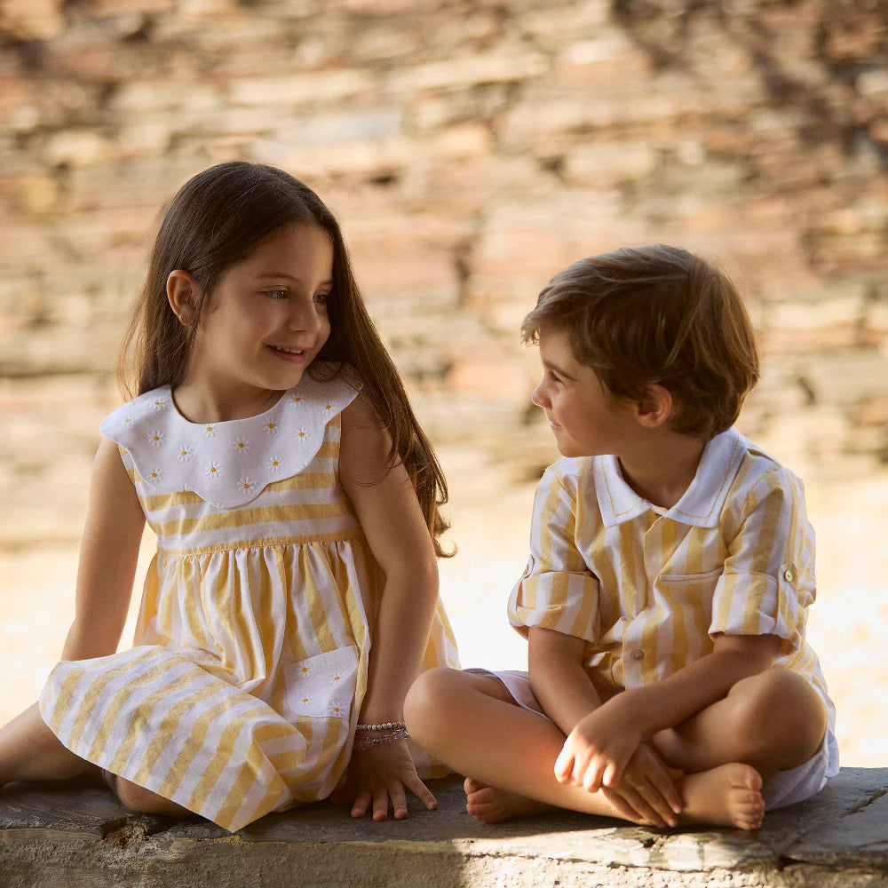 The Sunny Dress is a delightful blend of sunny yellow and crisp white, making it the perfect choice for summer days. Light, breezy, and effortlessly stylish, this dress is designed for comfort and charm, keeping little ones cool and radiant all season long. Deolinda is a premium Portuguese clothing brand that combines traditional craftsmanship with modern design to create elegant, high-quality, and comfortable children's apparel.