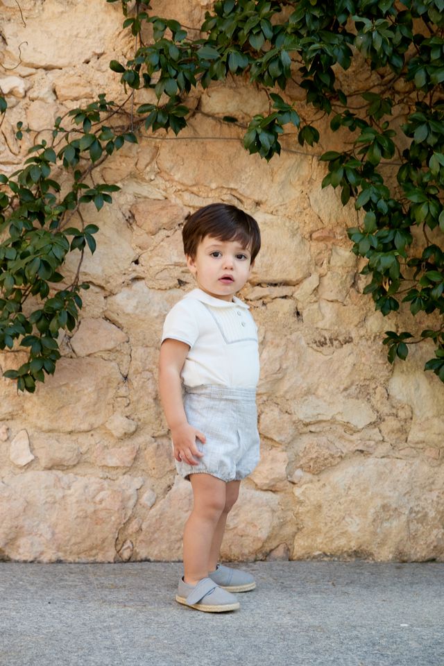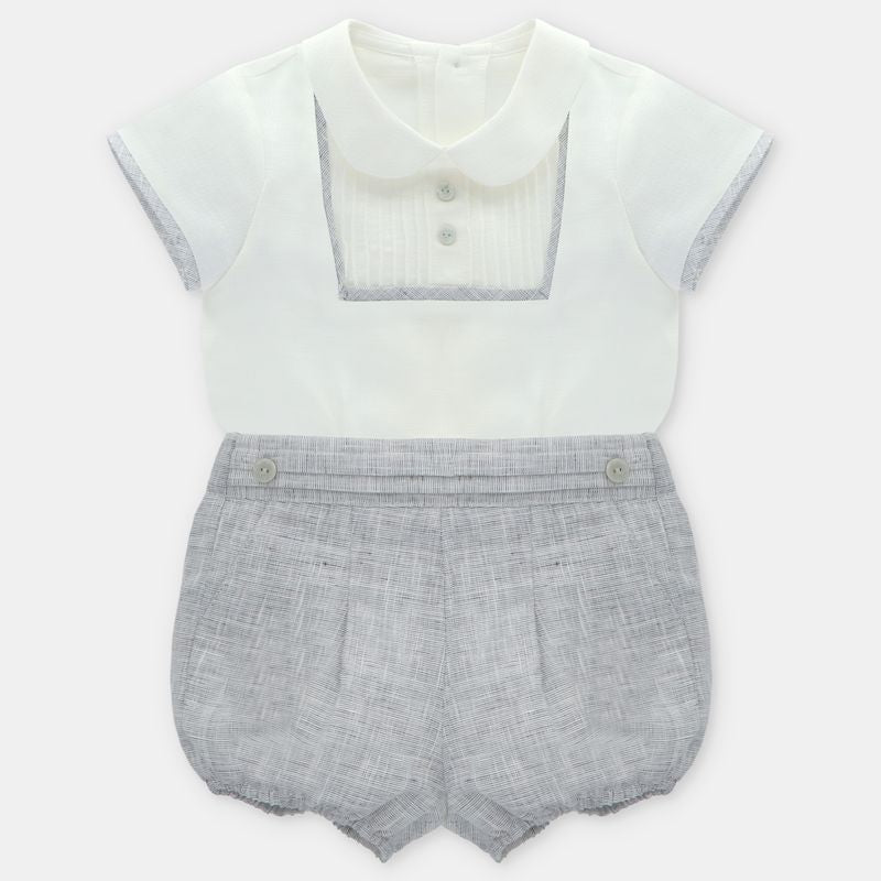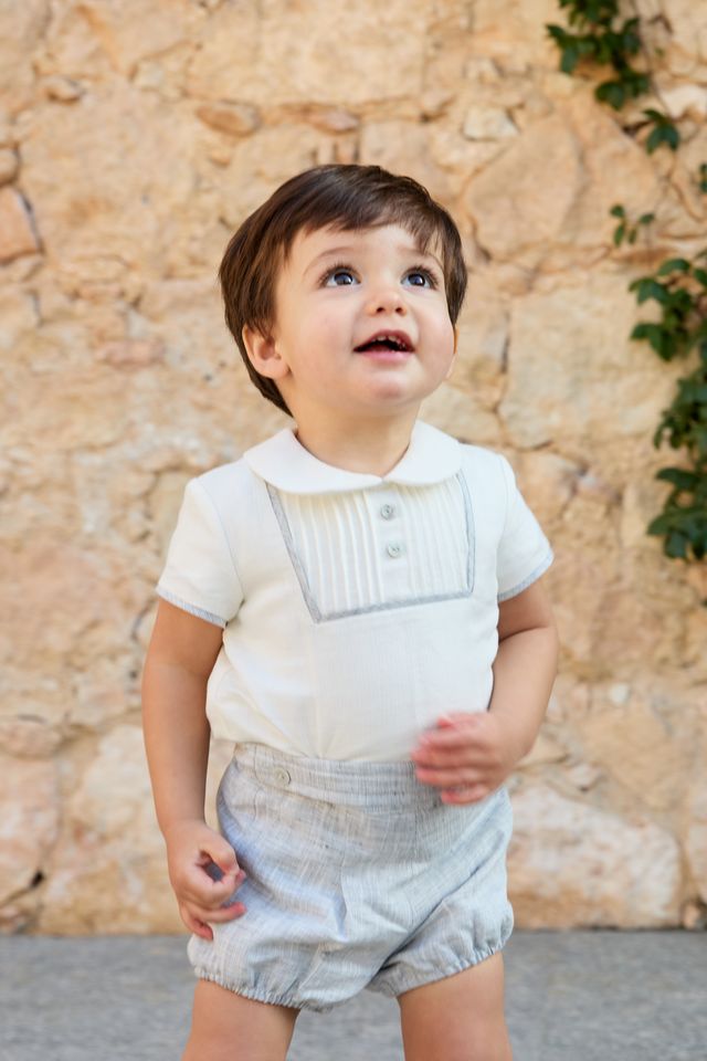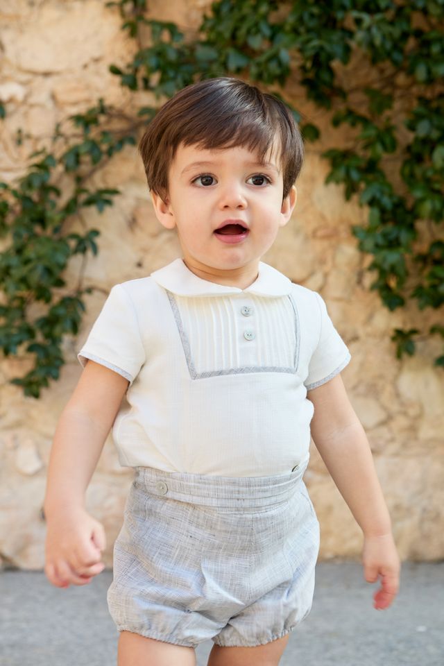 Effortlessly elegant, The Santiago Linen Set combines classic tailoring with breathable summer comfort. The ivory short-sleeved shirt features a pleated bib with contrast piping and sweet button details, paired with soft cloud grey linen bloomers. Designed for refined warm-weather outings, this heirloom-style outfit brings old-world charm with a modern twist.