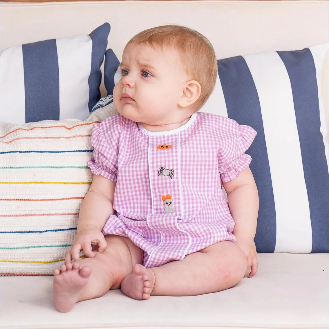 It's Spooky Season Y'all! This purple and white check dress is just spooky enough to be oh so cute! Featuring embroidered pumpkin, spider, and a ghost with a little bow! Fits True to Size. For best results, wash on gentle and hang to dry.